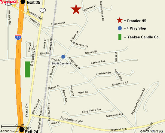 Take Interstate 91 North to Exit 24. Go right at the end of the ramp. Go straight throught the light. Go to the next light, you'll see Yankee Candle on the left, go right at that light. Come to the 4 way stop and go left. After approx 1/2 mile, Frontier will be on the left hand side. Go past the front of the school to the second entrance near the white house. Gym is in the back. Go to the glass door at turn right at the end of the hall and then right again to the gym.